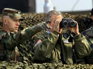 布什視察都羅山車站 稱南北鐵路是和平之路(圖) 2002年02月20日 14:41 ![]() 布什在非軍事區(qū)用望遠(yuǎn)鏡觀望朝鮮一側(cè)(美聯(lián)社) 中新網(wǎng)北京2月20日消息:韓國(guó)總統(tǒng)金大中和來(lái)訪的美國(guó)總統(tǒng)布什今天視察都羅山車站。這個(gè)車站是金大中希望連接平壤和漢城的鐵路線的北終點(diǎn)站。 據(jù)韓國(guó)聯(lián)合新聞社報(bào)道,金大中希望借此舉來(lái)敦促朝鮮對(duì)恢復(fù)對(duì)話的呼吁作出回應(yīng)。 在上午的首腦會(huì)談中,兩國(guó)總統(tǒng)就聽(tīng)取了這項(xiàng)連接南北的鐵路工程的進(jìn)度情況簡(jiǎn)報(bào)。 在舉行聯(lián)合記者招待會(huì)后,布什乘直升飛機(jī)花費(fèi)二十分鐘抵達(dá)非軍事區(qū)。這個(gè)二點(diǎn)五英里寬,一百五十一英里長(zhǎng)的區(qū)域布滿地雷,分界線兩側(cè)駐扎著將近朝韓兩百萬(wàn)軍隊(duì)。 美國(guó)在韓國(guó)保持有三萬(wàn)七千人的駐軍。布什在抵達(dá)時(shí)向一名指揮官威廉·米勒中校敬禮致意。 布什在都羅山車站發(fā)表講話。他說(shuō):“我們今天相聚在這里,周圍是朝鮮半島和平與穩(wěn)定受到挑戰(zhàn)時(shí)的遺跡。金大中總統(tǒng)剛才向我介紹了一條他修建的道路--一條和平之路。” 據(jù)路透社報(bào)道,布什敦促朝鮮對(duì)韓國(guó)開(kāi)放邊境。他說(shuō):“這條鐵路可能將這塊分裂的土地兩側(cè)的人民帶到一起來(lái)。為了朝鮮半島全體人民的福祉,朝鮮應(yīng)該完成它。” 布什在非軍事區(qū)的講話強(qiáng)硬的措詞中也顯示出靈活性。他甚至在談及朝鮮時(shí)仍使用了“邪惡”這個(gè)字眼,但他同時(shí)也重申了朝鮮對(duì)話的建議。 在一個(gè)觀察哨所里,布什身穿一件手臂上繡有美國(guó)國(guó)旗的綠色軍用夾克,通過(guò)雙筒望遠(yuǎn)鏡從壘著沙袋的地堡內(nèi)觀察朝鮮一側(cè)。
