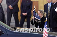 ![]() 美國(guó)總統(tǒng)布什與夫人二十一日上午抵達(dá)北京首都國(guó)際機(jī)場(chǎng),開(kāi)始為期兩天的工作訪(fǎng)問(wèn)。中新社圖 毛建軍 攝 ![]() 美國(guó)白宮工作人員二十一日在北京首都國(guó)際機(jī)場(chǎng)為美國(guó)總統(tǒng)布什座駕安裝旗幟。中新社記者 毛建軍 攝