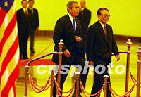 中新社北京二月二十一日電 題:江澤民主席主持儀式歡迎布什總統(tǒng) 中新社記者 朱大強 早春二月,美國總統(tǒng)喬治·沃克·布什來到北京,來到人民大會堂,受到中國國家主席江澤民的熱烈歡迎。 今天的大會堂北大廳,地上鋪著紅地毯,莊嚴(yán)的五星紅旗和星條旗分別豎立在檢閱臺兩側(cè),威武的三軍儀仗隊正面排列、記者們的攝像和攝影鏡頭調(diào)準(zhǔn)焦距…… 上午十一時,江澤民和夫人王冶坪在大會堂北大廳門口歡迎布什和夫人勞拉。兩國元首熱烈握手,這是自去年十月他們在上海會晤四個月后首次在北京見面。 布什總統(tǒng)身著深色西裝,系著蘭色領(lǐng)帶,春風(fēng)得意。 在相互介紹雙方參加歡迎儀式主要官員后,江澤民主席與布什總統(tǒng)走上檢閱臺本國國旗一側(cè),江澤民主席夫人王冶坪和布什總統(tǒng)夫人勞拉站立其后。軍樂隊奏響美國國歌和中國國歌。之后,布什總統(tǒng)在江澤民主席的陪同下,檢閱儀仗隊,當(dāng)走到中國人民解放軍軍旗前時,布什立正向軍旗行注目禮。 訪問北京是布什時隔二十多年后故地重游。上個世紀(jì)七十年代中期,布什的父親老布什出使中國時,他曾來北京探望過父母。所以,布什對北京并不生疏,所不同的是北京的發(fā)展太快了。 更有新意的是今天巧為尼克松總統(tǒng)三十年前訪華紀(jì)念日,作為第五十四屆美國總統(tǒng),布什踏著尼克松、老布什的足跡訪問中國,使命重大。布什說:中國是一個偉大的國家,美國必須努力與中國發(fā)展良好、真誠的關(guān)系。 這是一個重要契機,此次江澤民主席與布什總統(tǒng)的會晤,將明確宣示中美兩國保持和擴大的合作領(lǐng)域,取得多方面的積極成果。 十分鐘的歡迎儀式結(jié)束了。在軍樂聲中,踏著中國的紅地毯,江澤民主席與布什總統(tǒng)像老朋友一樣,邊走邊交談著,走向會談廳。