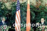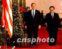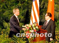 ![]() 中國(guó)國(guó)家主席江澤民請(qǐng)美國(guó)總統(tǒng)布什登上北京的紅地毯,共同出席二十一日中午會(huì)見(jiàn)記者的電視直播。中新社記者 賈國(guó)榮 攝