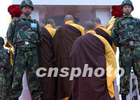 組圖:咸陽機(jī)場(chǎng)戒備森嚴(yán)護(hù)衛(wèi)佛指舍利 2002年02月23日 17:28 ![]() 法門寺佛指舍利赴臺(tái)灣地區(qū)瞻禮(供奉)恭送法會(huì)二十三日在西安咸陽機(jī)場(chǎng)舉行圖為當(dāng)?shù)卣沙鼍臁⑽渚_保佛指舍利安全。中新社圖 錢興強(qiáng) 攝 ![]() 法門寺佛指舍利二十三日在武警嚴(yán)密護(hù)送下,運(yùn)抵西安咸陽機(jī)場(chǎng)。中新社圖 錢興強(qiáng) 攝