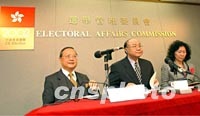 ![]() 香港選舉管理委員會主席胡國興(中)、委員梁乃鵬(左)及成小澄博士28日出席宣布董建華為香港特區(qū)第二任行政長官候任人新聞發(fā)布會。中新社圖 洪少葵 攝