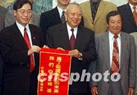 董建華會見臺灣"中國統(tǒng)一聯(lián)盟一國兩制參訪團" 2002年04月11日 08:38 ![]() 香港特區(qū)行政長官董建華,4月10日在香港禮賓府會見臺灣中國統(tǒng)一聯(lián)盟“一國兩制參訪團”,團長王津平(左一)向董建華贈送錦旗。中新社記者 任晨鳴 攝
