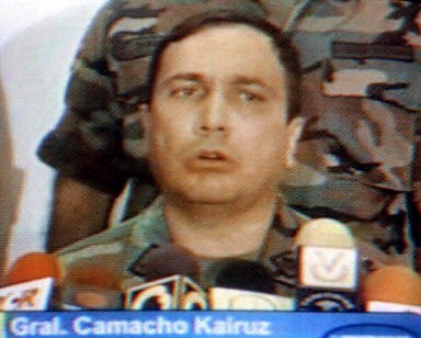 ![]() 委內(nèi)瑞拉當(dāng)?shù)貢r(shí)間4月11日晚(北京時(shí)間12日上午),國民警衛(wèi)隊(duì)的卡伊魯茲將軍在當(dāng)?shù)仉娨暸_(tái)宣布,總統(tǒng)查韋斯的政府已經(jīng)“不再履行其職能”,全國局勢已經(jīng)被軍隊(duì)控制。圖為卡伊魯茲將軍在電視臺(tái)講話時(shí)的電視截頻圖像。(春風(fēng))