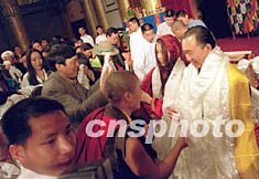 ![]() 臺灣名人陳履安之子日前在京新婚,來自尼泊爾、臺灣等地的佛徒趕到北京,參加陳宇廷和藏族姑娘央金拉姆的婚禮,爭相為新婚人送哈達。作者:王麗南