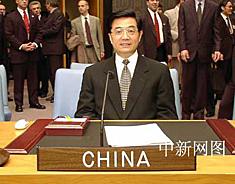 圖:胡錦濤在聯(lián)合國安理會做"五秒鐘代表" 2002年04月30日 08:44 ![]() 美國東部時間四月二十九日下午,中國國家副主席胡錦濤一行在首次對美國進行正式訪問期間,來到紐約聯(lián)合國總部參觀。在聯(lián)合國安理會會議廳中,胡錦濤坐到常任理事國中國的代表席上留影,并笑稱:“讓我當個五秒鐘的代表吧!敝行律缬浾 陳建 攝