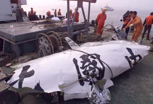 圖文:打撈起重要飛機殘骸 搜尋范圍進一步縮小 2002年05月12日 07:32 ![]() “五-七”空難現(xiàn)場又打撈出一塊較大的飛機殘骸,殘骸上“中國北”三個字清晰可見。(中新社記者王麗南攝) 中新網(wǎng)大連5月12日消息:昨日深夜11時25分,交通部救撈局局長宋家慧給新華社記者打手機說:“今天搜救工作取得重要進展,打撈起飛機頂蓋、起落架、應急發(fā)電機、應急門、輪胎等重要飛機殘骸,這將對事故原因分析起到重要作用! 據(jù)新華社報道,宋家慧的聲音在電話里提高了聲調:“更重要的是,根據(jù)已打撈出水的機頭殘骸到機尾殘骸的位置,我們已經(jīng)把飛機墜落的區(qū)域縮小在長600米、寬400米東西方向海域內,為下一階段的‘黑匣子’打撈和搜救工作開展打開了新的局面! 據(jù)宋家慧介紹,明天一些救撈船只將暫時調離現(xiàn)場,等待從國外調集的“黑匣子”專用控測設備到達后再次展開新一輪打撈工作。(完)