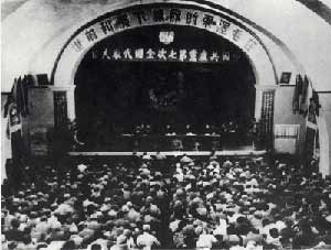 圖文:中國共產(chǎn)黨第七次全國代表大會簡介 2002年05月14日 17:10 ![]() 圖為七大會場 1945年4月23日至6月11日,中國共產(chǎn)黨第七次全國代表大會在延安楊家?guī)X中央大禮堂召開,歷時(shí)50天。出席大會的正式代表547名,候補(bǔ)代表208名,共計(jì)755名,代表全國121萬黨員。大會選出毛澤東、朱德、劉少奇、周恩來、任弼時(shí)、林伯渠、彭德懷、康生、陳云、陳毅、賀龍、徐向前、高崗、張聞天、彭真15人組成主席團(tuán),選舉任弼時(shí)為大會秘書長、李富春為副秘書長。 大會的主要議程是:毛澤東作《論聯(lián)合政府》的政治報(bào)告;劉少奇作《關(guān)于修改黨的章程的報(bào)告》;朱德作《論解放區(qū)戰(zhàn)場》的軍事報(bào)告;周恩來作《論統(tǒng)一戰(zhàn)線》的報(bào)告;任弼時(shí)作關(guān)于黨的歷史問題的報(bào)告;通過新的黨章,選舉新的中央委員會。6月9日,選舉中央委員會委員4 4名。6月1 0日,選舉中央委員會候補(bǔ)委員3 3名。6月1 1日,大會閉幕,毛澤東致題為《愚公移山》的閉幕詞。