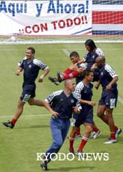 哥斯達(dá)黎加隊(duì)在日本鈴鹿市進(jìn)行首次訓(xùn)練(圖) 2002年05月15日 14:42 ![]() 哥斯達(dá)黎加國(guó)腳們進(jìn)入集訓(xùn)地后立刻開始訓(xùn)練(14日上午攝于三重縣鈴鹿市的運(yùn)動(dòng)場(chǎng)=共同社) 中新網(wǎng)北京5月15日消息:世界杯參賽國(guó)——哥斯達(dá)黎加國(guó)家隊(duì)14日在三重縣鈴鹿市的運(yùn)動(dòng)場(chǎng)內(nèi)進(jìn)行了首次訓(xùn)練,開始了備戰(zhàn)世界杯正式比賽的調(diào)整訓(xùn)練。 據(jù)“共同社”報(bào)道,哥斯達(dá)黎加隊(duì)作為首支到達(dá)日本的世界杯參賽國(guó)于13日晚上到達(dá)鈴鹿市。在主教練吉馬雷斯的指揮下,23名球員在用球訓(xùn)練中進(jìn)行了小比賽等,大聲呼喊汗流浹背。右膝傷病令人擔(dān)心的主力前鋒萬喬普也展示了輕快的動(dòng)作。 吉馬雷斯主教練表示“訓(xùn)練環(huán)境非常好。我們的目標(biāo)是在世界杯中盡可能走得遠(yuǎn)一點(diǎn)?傊椭袊(guó)隊(duì)進(jìn)行的首場(chǎng)比賽非常重要!备缢惯_(dá)黎加隊(duì)將在鈴鹿市集訓(xùn)到23日。