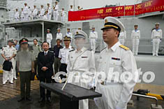 ![]() 中國(guó)海軍首次環(huán)球航行訪問(wèn)艦艇編隊(duì)指揮員丁一平少將,二十三日上午在新加坡海軍基地樟宜港致答辭,感謝新加坡各界的熱烈歡迎。中新社圖 躍勝岐 攝