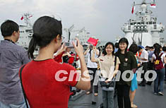 圖文:中國(guó)環(huán)球航行訪問(wèn)艦艇編隊(duì)首訪新加坡 2002年05月23日 19:08 ![]() 二十三日上午,興致勃勃的中國(guó)留學(xué)生在新加坡樟宜港登上中國(guó)海軍首次環(huán)球航行訪問(wèn)艦艇編隊(duì)的“青島號(hào)”艦艇,參觀和留影。中新社圖 躍勝岐 攝