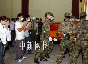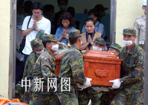 組圖:馬公空軍基地成華航遇難者身份辨認(rèn)中心 2002年05月26日 22:56 ![]() 部分失事華航客機(jī)遇難乘客遺體從澎湖空運(yùn)回臺灣島。5月26日傍晚,部分已經(jīng)確認(rèn)身份的失事華航客機(jī)遇難乘客尸體被巨型C130運(yùn)輸機(jī)運(yùn)回臺灣島。中新社傳真任晨鳴攝 ![]() 多數(shù)華航遇難乘客家屬選擇土葬。5月26日,臺灣澎湖馬公空軍基地成為搜索到的遇難乘客尸體辨認(rèn)中心。中新社傳真任晨鳴攝 ![]() 擺放在臺灣澎湖馬公空軍基地中的盛殮遇難者遺體的棺材。5月26日,臺灣澎湖馬公空軍基地中的遇難乘客尸體辨認(rèn)中心排列了眾多棺材。中新社傳真任晨鳴攝 ![]() 華航遇難乘客家屬送親人上靈車。5月26日下午,確認(rèn)了身份的華航遇難乘客尸體被家屬送上靈車。中新社傳真任晨鳴攝 ![]() 臺灣澎湖馬公空軍基地成為華航遇難乘客身份辨認(rèn)中心。一向門禁森嚴(yán)的臺灣澎湖馬公空軍基地,5月26日人流不息,成為華航遇難乘客的身份辨認(rèn)中心。中新社傳真任晨鳴攝 鄭重聲明:關(guān)于臺灣華航飛機(jī)失事的新聞信息,系中新網(wǎng)特稿,未經(jīng)書面授權(quán),不得采用。