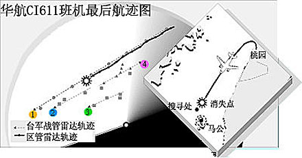 圖:"華航"失事客機(jī)雷達(dá)軌跡顯示高空解體情形 2002年05月27日 15:39 ![]() 臺灣“華航”CI611班機(jī)25日下午3時28分在馬公西北方10里、高度35000英尺處失事(左圖實線中止處),臺軍的戰(zhàn)管雷達(dá)當(dāng)時追蹤到四個區(qū)域有雷達(dá)反應(yīng)(圖中所標(biāo)的1、2、3、4處),其中三個光點朝西南方,約和飛機(jī)航行方向相同,另一光點(4號)卻朝東北方向快速移動。此軌跡顯示失事班機(jī)在高空解體,并至少裂成四大塊。(臺灣聯(lián)合報圖) 鄭重聲明:關(guān)于臺灣華航飛機(jī)失事的新聞信息,系中新網(wǎng)特稿,未經(jīng)書面授權(quán),不得采用。