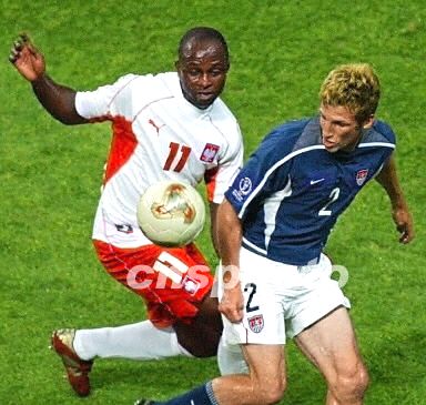 圖:波蘭3:1美國(guó) 奧利薩德貝與哈久克爭(zhēng)搶 2002年06月14日 21:44 ![]() 韓日世界杯D組波蘭隊(duì)與美國(guó)隊(duì)的比賽結(jié)束,比分為波蘭隊(duì)3-1戰(zhàn)勝美國(guó),11號(hào)奧利薩德貝為波蘭隊(duì)先入一球,9號(hào)克里扎洛維茨攻入第二球,14號(hào)澤瓦拉科夫攻入第三球。美國(guó)隊(duì)21號(hào)多諾萬(wàn)攻入一球。圖為波蘭隊(duì)奧利薩德貝與美國(guó)哈久克爭(zhēng)搶。