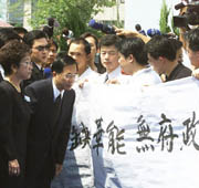 圖文:臺(tái)灣華航空難公祭 罹難者家屬抗議當(dāng)局無(wú)能 2002年06月22日 15:58 ![]() 罹難者家屬向阿扁表示抗議 聯(lián)合報(bào)/圖 中新網(wǎng)香港6月22日消息:臺(tái)北訊,臺(tái)灣當(dāng)局今天上午在臺(tái)北市為“五·二五”華航空難罹難者舉行聯(lián)合公祭。眾多罹難者家屬手舉“冤沉大海、還我命來(lái)”標(biāo)語(yǔ),抗議當(dāng)局無(wú)能,并要求尋回每一具罹難者遺體。 據(jù)臺(tái)灣媒體報(bào)道,包括陳水扁、呂秀蓮等眾多島內(nèi)政壇人物在內(nèi),這場(chǎng)聯(lián)合公祭約有三千人參加,靈堂內(nèi)布有鮮花及225名罹難者的遺像,以及鐫刻罹難者姓名的石碑。 在靈堂正中央,設(shè)有一座名為“水火熱淚”的意像品。從失事現(xiàn)場(chǎng)取來(lái)的海水被注入“水火熱淚”中后,其中的火炬再被點(diǎn)燃,象征罹難者的精神與魂魄永遠(yuǎn)與親人同在。 據(jù)報(bào)道,當(dāng)陳水扁步入會(huì)場(chǎng)時(shí),傷心欲絕的罹難者家屬手舉白布條,一字排開,高喊著“不要敷衍我們、一定要找出真相”,有人邊流淚邊訴說(shuō),失蹤20多天的父親至今還不知下落,仍然被壓在海底。陳水扁稱“搜救沒有時(shí)間表”。 另外,不少罹難者家屬認(rèn)為,今天這場(chǎng)公祭只是一場(chǎng)虛情假意的惡心秀場(chǎng)。 罹難者陳杰人的胞兄難過(guò)地表示,這個(gè)星期三夜里,他夢(mèng)見了全身濕透的弟弟,在冰冷的海中載浮載沉,痛苦地向他喊著“哥哥,救命、救命”,當(dāng)他驚醒后,就再也無(wú)法入眠。 抗議的白布條上寫著“公祭咒我必死、救命救命、等了很久、我要回家、趕快來(lái)接我”等字句,陳家無(wú)奈地指出,打撈工作進(jìn)度實(shí)在太慢,這對(duì)家屬相當(dāng)不公平,目前還有60多位罹難者仍在深海中沉蕩,今日的聯(lián)合公祭“盛會(huì)”,是否宣告著政府與華航責(zé)任已了? 陳杰人的胞兄說(shuō),主事者的無(wú)作為,讓打撈工作空轉(zhuǎn)了20多天,直到受難者靈肉支離破碎的時(shí)刻,才找來(lái)確實(shí)有能力的新加坡打撈公司,今天公祭意義何在?只不過(guò)是一場(chǎng)虛情假意的惡心秀場(chǎng)。 華航一架波音747-200客機(jī)5月25日在臺(tái)灣海峽澎湖上空解體成4大塊,墜入海中,機(jī)上乘客及機(jī)組人員全部罹難。目前已找到了158具尸體,還有67具死難者的遺體還未找到。