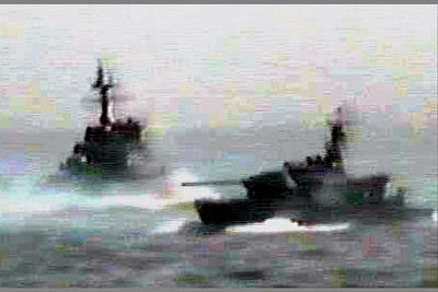 圖:朝鮮警備艇與韓國海軍高速艦在海面對峙 2002年06月29日 19:57 ![]() 韓國和朝鮮艦艇今晨在黃海海面發(fā)生交火,造成韓方4人死亡,至少18人受傷。此圖顯示朝鮮警備艇(右)與韓國海軍高速艇正在對峙之中。圖片為現(xiàn)場韓國海軍作戰(zhàn)部隊攝像機拍攝。(韓國聯(lián)合通訊社圖) 相關報道:韓國總統(tǒng)金大中的小兒子涉嫌受賄等罪出庭受審 相關報道:事件綜述:朝韓雙方互相指責 稱將采取應對措施 相關報道:韓朝海上交火事件:韓軍艇長等4人死亡22人受傷 相關報道:朝韓艦艇在海上交火 金大中今晚不看世界杯比賽 相關報道:新聞背景:1998年至今韓朝兩國海難事故大事記 相關報道:圖文:朝鮮和韓國軍艦發(fā)生交火 4名韓國人死亡