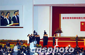 中新社香港七月一日電(記者張傳熙黃少華)慶祝香港回歸五周年大會(huì)暨第二屆香港特區(qū)政府就職典禮今天上午在香港會(huì)展中心新翼大會(huì)堂舉行。香港特別行政區(qū)第二任行政長(zhǎng)官董建華和第二屆特區(qū)政府十九名主要官員在莊嚴(yán)的儀式上宣誓就職。 世界的目光今早再度投向美麗的香港。座落在維多利亞港畔的香港會(huì)展中心新翼大會(huì)堂今早燈光璀璨,嘉賓如潮。紅色成了就職典禮的主色調(diào):呈梯形狀的主席臺(tái)上鋪著紅色地毯,政府官員沿著紅色臺(tái)階,魚貫登臺(tái)宣誓。 這標(biāo)志著香港特區(qū)首屆政府已順利完成歷史使命,繼任的新一屆政府已全部到位并開始運(yùn)作。 出席儀式的國(guó)家主席江澤民代表中央政府和全國(guó)各族人們,向新就任的特區(qū)第二任行政長(zhǎng)官董建華和第二屆政府主要官員、行政會(huì)議成員表示祝賀。江澤民還在會(huì)上發(fā)表講話,希望特區(qū)政府與各界人士與時(shí)并進(jìn),積極進(jìn)取,努力創(chuàng)造香港更加美好的未來(lái)。 上午,鮮花、綠樹裝點(diǎn)的香港會(huì)展中心新翼五樓大禮堂一片喜慶。會(huì)場(chǎng)正中的主席臺(tái)上方,懸掛著國(guó)旗和香港特區(qū)區(qū)旗。江澤民主席在行政長(zhǎng)官董建華的陪同下步入大會(huì)堂時(shí),全場(chǎng)二千名嘉賓起立鼓掌,向江澤民的到來(lái)表示熱烈歡迎。 八時(shí)五十九分,就職典禮在雄壯的國(guó)歌聲中拉開帷幕。最先走上主席臺(tái)宣誓就職的是行政長(zhǎng)官董建華。國(guó)家主席江澤民監(jiān)誓。董建華莊嚴(yán)地舉起右手,宣誓:“本人就任中華人民共和國(guó)香港特別行政區(qū)行政長(zhǎng)官,定當(dāng)擁護(hù)中華人民共和國(guó)香港特別行政區(qū)基本法,效忠中華人民共和國(guó)香港特別行政區(qū),盡忠職守,遵守法律,廉潔奉公,為香港特別行政區(qū)服務(wù),對(duì)中華人民共和國(guó)中央人民政府和香港特別行政區(qū)負(fù)責(zé)”。 宣誓畢,江澤民主席和董建華緊緊握手,全場(chǎng)掌聲如潮。 五年前的今天,董建華第一次宣誓就任首屆特區(qū)行政長(zhǎng)官。從那時(shí)起,香港的歷史改寫了,香港回到了祖國(guó)的懷抱,開始了港人治港的新里程。今天董建華再次宣誓就職,不同的是,他標(biāo)志著新一屆特區(qū)政府將承前啟后管治香港,對(duì)香港的未來(lái)將會(huì)有更多的承擔(dān)。 接著,江澤民監(jiān)誓下宣誓就職的還有由董建華提名、中央政府任命的第二屆特區(qū)政府十九名主要官員,包括三司十一局以及警務(wù)處、入境處、海關(guān)、廉政公署以及審計(jì)處官員。而改組后的行政會(huì)議十九名成員也在董建華的監(jiān)誓下,由政務(wù)司司長(zhǎng)曾蔭權(quán)帶領(lǐng)宣誓就職。 第二屆行政長(zhǎng)官董建華在宣誓禮畢后發(fā)表講話。他說,在我即將履行第二任行政長(zhǎng)官職責(zé)的時(shí)候,我意識(shí)到所面對(duì)的形勢(shì)是嚴(yán)峻的,擔(dān)任的責(zé)任是重大的。他說,帶領(lǐng)香港經(jīng)濟(jì)走出困境,恢復(fù)市民對(duì)前景的信心,是本屆政府面對(duì)的挑戰(zhàn)。 他表示,政府將竭盡所能,充分利用內(nèi)地經(jīng)濟(jì)發(fā)展的機(jī)會(huì),開拓香港的發(fā)展空間,香港將會(huì)加快和廣東省的全面合作。他表示相信,過去五年的調(diào)整和適應(yīng),雖然歷盡艱辛,但卻又為香港將來(lái)的興旺奠定了基礎(chǔ)。他相信香港在各界的精誠(chéng)團(tuán)結(jié)努力下,一定能夠走出困境。 江澤民主席在會(huì)上發(fā)表講話,充分肯定了香港過去五年所取得的成就。江澤民指出,香港回歸祖國(guó)以來(lái)的五年,是“一國(guó)兩制”由科學(xué)構(gòu)想變?yōu)樯鷦?dòng)現(xiàn)實(shí)的五年,也是董建華先生領(lǐng)導(dǎo)的特區(qū)政府團(tuán)結(jié)各界人士不斷克服困難、奮力前進(jìn)的五年。他說今天的香港,“一國(guó)兩制”、“港人治港”、高度自治方針得到全面落實(shí),原有的資本主義制度保持不變,廣大居民繼續(xù)以自己習(xí)慣的方式生活。香港仍然保持著自由港的特色和國(guó)際貿(mào)易、金融、航運(yùn)中心的地位,繼續(xù)被公認(rèn)為亞洲乃至全球最具活力的地區(qū)之一。 江澤民說,事實(shí)充分證明,“一國(guó)兩制”是完全行得通的,董建華先生及其領(lǐng)導(dǎo)的特區(qū)政府是具有駕馭復(fù)雜局勢(shì)的能力的,香港人是完全能夠治理好香港的。他說,五年來(lái)我們所獲得的經(jīng)驗(yàn)和體會(huì),歸結(jié)起來(lái),就是在任何情況下都必須全面正確地貫徹“一國(guó)兩制”的方針和香港基本法,全力支持行政長(zhǎng)官和特區(qū)政府依法施政。 江澤民說,現(xiàn)在世界多極化和經(jīng)濟(jì)全球化趨勢(shì)深入發(fā)展,科技進(jìn)步日新月異,綜合國(guó)力競(jìng)爭(zhēng)日趨激烈,國(guó)際局勢(shì)正在發(fā)生深刻的變化。他說,中國(guó)正在實(shí)施現(xiàn)代化建設(shè)的第三步戰(zhàn)略目標(biāo),今后五到十年,也是香港經(jīng)濟(jì)和社會(huì)發(fā)展的關(guān)鍵時(shí)期。 江澤民在講話中,還提出三點(diǎn)希望:希望香港各界更好地適應(yīng)香港回歸后的發(fā)展形勢(shì),當(dāng)好香港和偉大祖國(guó)的主人;希望