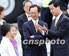 圖:梁振英、梁錦松向?qū)W童問(wèn)好 2002年07月01日 18:16 ![]() 香港行政會(huì)議召集人梁振英(右)、財(cái)政司長(zhǎng)梁錦松等香港高官,7月1日在香港國(guó)際機(jī)場(chǎng)為國(guó)家主席江澤民送行前,與為江主席獻(xiàn)花的學(xué)童問(wèn)好。中新社圖 洪少葵 攝