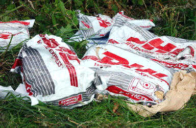 圖文:DHL公司的郵袋散落在地 2002年07月03日 14:36 德國當(dāng)?shù)貢r間7月1日夜(北京時間2日晨),一架DHL公司的波音757貨機(jī)和俄羅斯巴什基爾航空公司的圖-154客機(jī)在德國巴登-符騰堡州于伯林根鎮(zhèn)上空相撞并墜毀,至少已造成71人死亡,其中包括52名兒童。圖為DHL公司的郵袋散落在地。(春風(fēng))