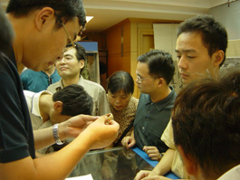拍賣場上,起拍價萬元以上的拍品應(yīng)者寥寥,其他拍品爭奪則異常激烈。第一件起拍價為一千四百元的緬甸翡翠玉手鐲即掀起小高潮,幾輪競價后以二千元價格賣出。隨后不久,一副周懷民作梅竹圖引起第二輪爭搶。四十四號競拍者和一百六十九號競拍者兩人針鋒相對,價格由起拍價二千八百元一路抬高至五千一百元,最終由四十四號競拍者在現(xiàn)場一片掌聲中拿下。
