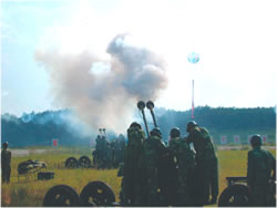 “敵”其他批次的轟炸機、巡航導彈不甘心失敗,仍在不斷臨近我軍保衛(wèi)的目標。我高炮營對第二批次的兩架“敵機”進行集火射擊,在震耳欲聾的高炮聲中,1架“敵機”被擊中,另一架“敵機”未擊中我方目標。不久,第三批次的3架“敵機”又飛臨我方上空進行襲擊,首先開火的是高炮營,而已經(jīng)機動到其他陣位的我便攜式地空導彈也隨即發(fā)射,一架“敵機”中彈后凌空爆炸!皵场钡谒呐窝埠綄椊吁喽,我地空導彈、高射機槍、高炮同時開火射擊,陣地上響起一片各種武器發(fā)射時的聲響,巡航導彈被擊中冒出了黑煙。