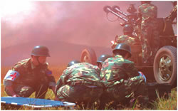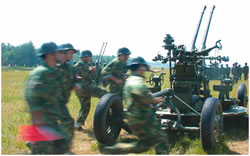 演習剛剛開始,一隊民兵在我高炮陣地附近忙碌著,他們很快設(shè)立了一個高炮陣地,原來他們是用報廢的高炮設(shè)置了一個假高炮陣地以迷惑來襲之“敵”。與此同時,另一隊民兵在旁邊給一枚導彈模型充氣,不到一分鐘,這枚同樣是用于迷惑“敵人”的地空導彈便豎立起來。