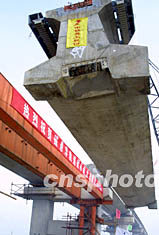 五日,隨著第2550根預(yù)應(yīng)力混凝土軌道梁穩(wěn)穩(wěn)地架設(shè)在磁懸浮工程的蓋梁上,上海磁懸浮工程實(shí)現(xiàn)了軌道梁全線貫通。圖為第2550根軌道梁架設(shè)成功。作者:湯彥俊