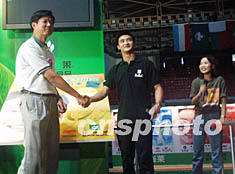 中國著名跳水運(yùn)動(dòng)員、二000年悉尼奧運(yùn)會(huì)跳水冠軍田亮五日與安利(中國)日用品有限公司簽約,成為安利紐崔萊代言人。圖為簽字儀式上,安利大中華區(qū)副總裁顏志榮(右三)與田亮握手致意。作者:潘旭臨