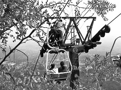 據(jù)了解,昨天中午12時20分左右,為香山公園布置監(jiān)控系統(tǒng)的北京機械科學(xué)研究院監(jiān)控工作室在布線過程中,因為施工用的鋼纜卡住一輛纜車,造成纜車上一名游客跌落下來受傷,另一名游客吊在空中時被工作人員及時救下。事故發(fā)生在11到12支架之間,一度引起整個索道停運。記者在現(xiàn)場看到,事故發(fā)生處的索道鋼纜纏成一團亂麻,有工程人員站在鋼纜上將纏住的線剪斷。