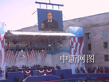今天的儀式在去年被客機撞毀的五角大樓西側(cè)舉行,這里如今已重建并裝飾一新。上午九時三十分,美國軍樂隊奏響了紀念序曲。九時三十七分-去年飛機撞擊五角大樓的時刻,全場默哀。美國國旗從五角大樓頂部舒卷而下,布什帶領一百名兒童宣誓。