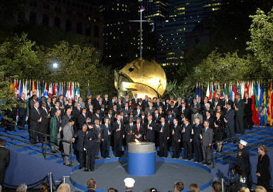 罹難者人數(shù)最多的紐約世貿廢墟是今天全美紀念活動的中心,數(shù)以萬計的人今天早晨聚集在這里聆聽每一位罹難者的名字,沿著長長的斜坡走進七層樓深的世貿廢墟中為他們獻花。當暮色降臨的時候,距離世貿廢墟不遠的炮臺公園點燃了一簇火焰,聯(lián)合國秘書長安南、美國國務卿鮑威爾、紐約市長布隆博格以及中國外長唐家璇等來自罹難者家鄉(xiāng)的代表一起舉起點燃的蠟燭,悼念死難者。與此同時,紐約的五個行政區(qū)的公園里也聚集了眾多的市民,搖曳的燭光寄托著對逝者的思念。