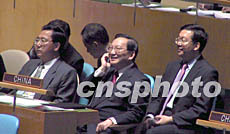 在紐約聯(lián)合國(guó)總部進(jìn)行的五十七屆聯(lián)大一般性辯論中,唐家璇談到實(shí)現(xiàn)發(fā)展的新思路時(shí)這樣說。