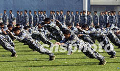 北京市保安系統(tǒng)首屆運動會九月十五日在奧體中心舉行。此次運動會是該系統(tǒng)組建十六年以來的第一次,也是對北京四萬九千余名保安員的大閱兵。圖為開幕式上精彩的防衛(wèi)術(shù)及擒拿術(shù)表演。任海霞 攝