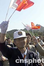 一位日本老人二十二日手舉中日兩國國旗在北京八達(dá)嶺長城腳下參加“中日友好萬人友誼林”植樹活動。這次活動是為紀(jì)念中日邦交正;苣甓e行的。作者:滿會喬