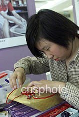 “匯豐中華慈善殘疾兒童藝術(shù)展”二十四日在北京開幕,來自培智學(xué)校的殘疾孩子在現(xiàn)場(chǎng)表演“中國(guó)結(jié)”的制作。作者:滿會(huì)喬
