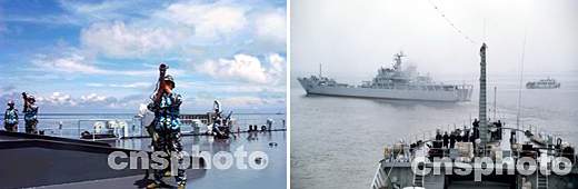 左圖:登陸兵在艦上進行防空演練。 右圖:艦艇編隊在航行中演練。