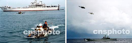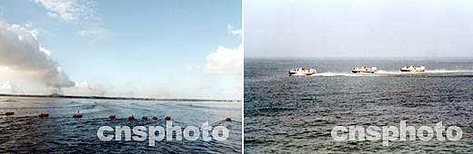 左圖:新型氣墊船沖擊上陸。 右圖:艦艇在海上進行隊形變化。