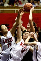 三名韓國(guó)球員(白色球衣)阻擋澳大利亞十一號(hào)杰克遜(綠色球衣)投籃。在二十五日進(jìn)行的十四屆女籃錦標(biāo)賽三四名決賽上,澳大利亞戰(zhàn)勝韓國(guó)奪得季軍,杰克遜一人獨(dú)得三十二分。作者:鄭萍萍