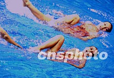 澳門(mén)花樣游泳雙人組合在釜山亞運(yùn)會(huì)二日決賽上演水中“梁!,富于美感。作者:賈國(guó)榮