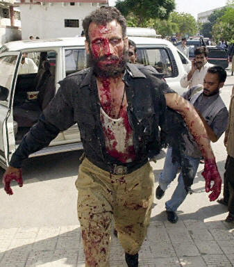 巴基斯坦警方16日說,巴南部城市卡拉奇的警察局和其它政府機(jī)關(guān)的多個(gè)辦公室當(dāng)天接連發(fā)生郵包炸彈爆炸案,雖未造成人員死亡,但至少有9人受傷。圖為被郵包炸彈炸傷的警察。