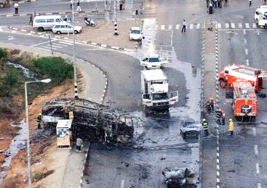 以色列電視和電臺報(bào)導(dǎo)說,一輛吉普類型的汽車在以色列巴德卡納鎮(zhèn)駛向一輛公車旁并引爆,汽車上載有炸藥和數(shù)罐汽油,還坐有兩人。