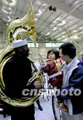 22日,美國(guó)芝加哥軍樂(lè)隊(duì)一早來(lái)到奧黑爾機(jī)場(chǎng),準(zhǔn)備迎接中國(guó)國(guó)家主席江澤民來(lái)訪,一名樂(lè)手與兩歲的中國(guó)小女孩互致問(wèn)候。作者:王瑤