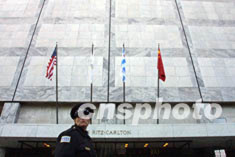 22日,一名芝加哥女警員在市中心里茲酒店前執(zhí)行任務(wù),確保剛剛到訪的中國(guó)國(guó)家主席江澤民一行訪問(wèn)順利。作者:王瑤