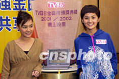 樂壇組合Twins兩位成員鍾欣桐、蔡卓妍10月23日在香港出席《TVB8金曲榜頒獎典禮2001/2002》記者會,Twins在網(wǎng)上向喜愛的歌曲投票。鄧慶樂 攝