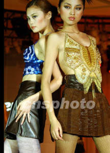 2002年中國義烏國際小商品博覽會日前在浙江義烏市舉行,中外客商云集、精品薈萃,中國著名襪業(yè)品牌“夢娜”有限公司在博覽會上推出中國首場腿部時裝秀。圖為模特向中外客商展示精美襪裝。作者:錢興強