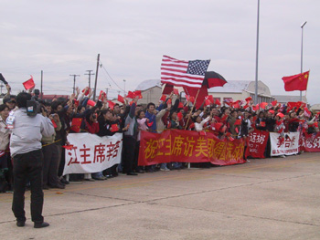 當江澤民專機降落在洛斯卡沃斯國際機場時,中國香港特區(qū)行政長官董建華夫婦,先期抵達的中國外交部長唐家璇,外經(jīng)貿部長石廣生、中國駐墨西哥大使李金章和墨西哥一名副外長等在舷梯旁迎接。