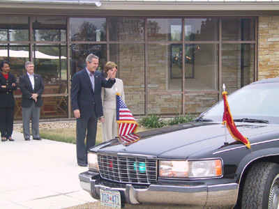 會談后,布什總統(tǒng)駕車陪同江主席夫婦參觀他的牧場。中午布什夫婦在家中設(shè)宴款待江澤民和夫人。