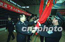 為迎接中共十六大,十一月一日全市八個城區(qū)的七十萬治安保衛(wèi)人員走上街頭,維護治安秩序,預(yù)防各類案件及災(zāi)害事故的發(fā)生。圖為北京宣武警方為此舉行了隆重的授旗儀式。作者:任海霞