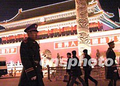 兩位武警戰(zhàn)士一日晚在天安門前值勤。北京加強(qiáng)安全保衛(wèi)工作,確保中國共產(chǎn)黨第十六次全國代表大會(huì)順利召開。作者:武仲林