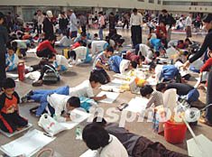 迎接“十六大”現(xiàn)場中小學生書法比賽在珠海舉行,共有五百名中、小學生參加。作者:石頭